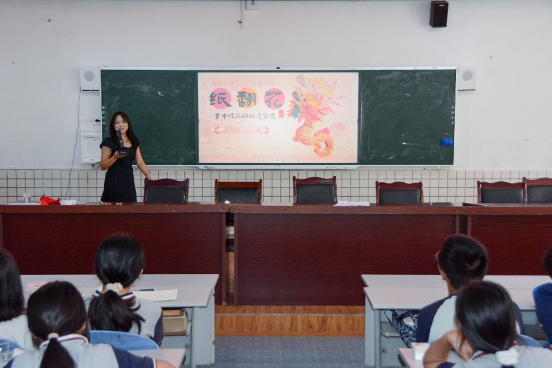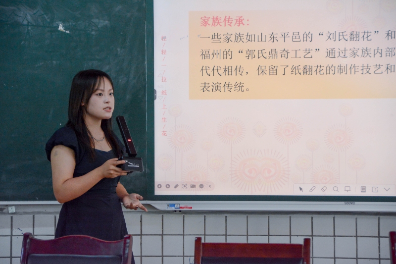 課堂伊始,甄好老師通過視頻直觀展示紙翻花的奇妙形態,翻飛間的百變造型瞬間點燃了大家的興趣,引發同學們的連聲驚嘆。隨后,老師系統介紹紙翻花的起源與發展脈絡,從明清時期的街頭玩具到如今的非遺項目,讓同學們體會到了非遺文化的悠久歷史。同時,老師還從家族傳承與社會傳承兩方面,講述了非遺傳承人及社會各界為保護、發揚傳統技藝所做的努力,讓同學們深刻理解傳承背后的責任與擔當。