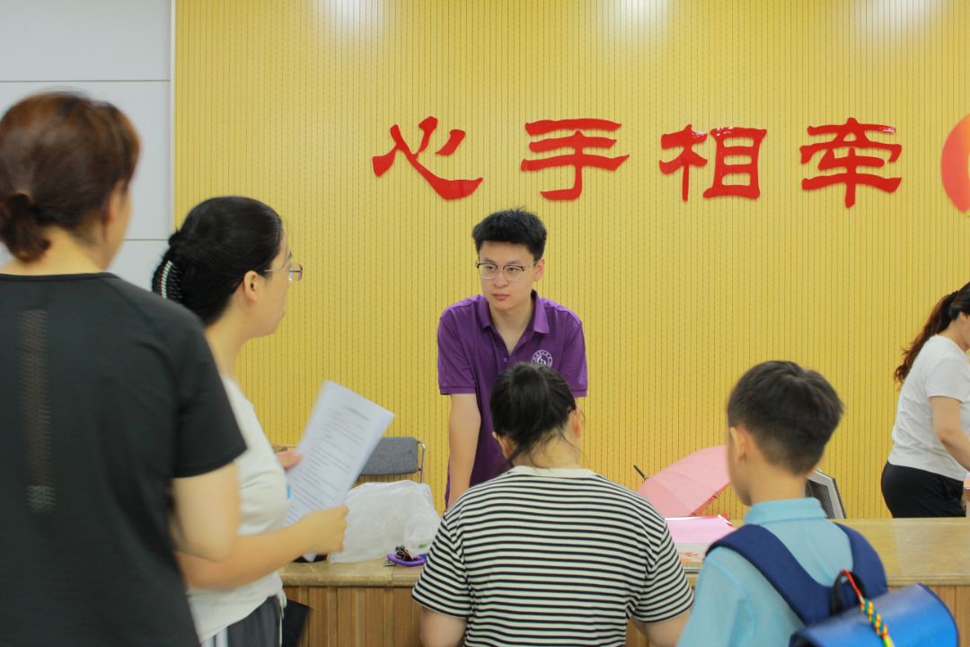 成員們來到社區后,已經有不少想要了解“齊小團”暑期課堂的家長在服務中心等待,進行“齊小團”第二期的報名工作。此時社區工作人員也已忙得不可開交。工作人員們看到實踐團成員們的到來,首先對大家進行了鼓勵,然后根據現場情況給成員們安排了工作——幫助指導“齊小團”暑期課堂學生家長填寫報名表。成員們根據任務流程,將工作分為接待、填寫、電腦錄入等環節,成員們各司其職,保證井然有序的同時更好地完成工作,做到高效率、人滿意。