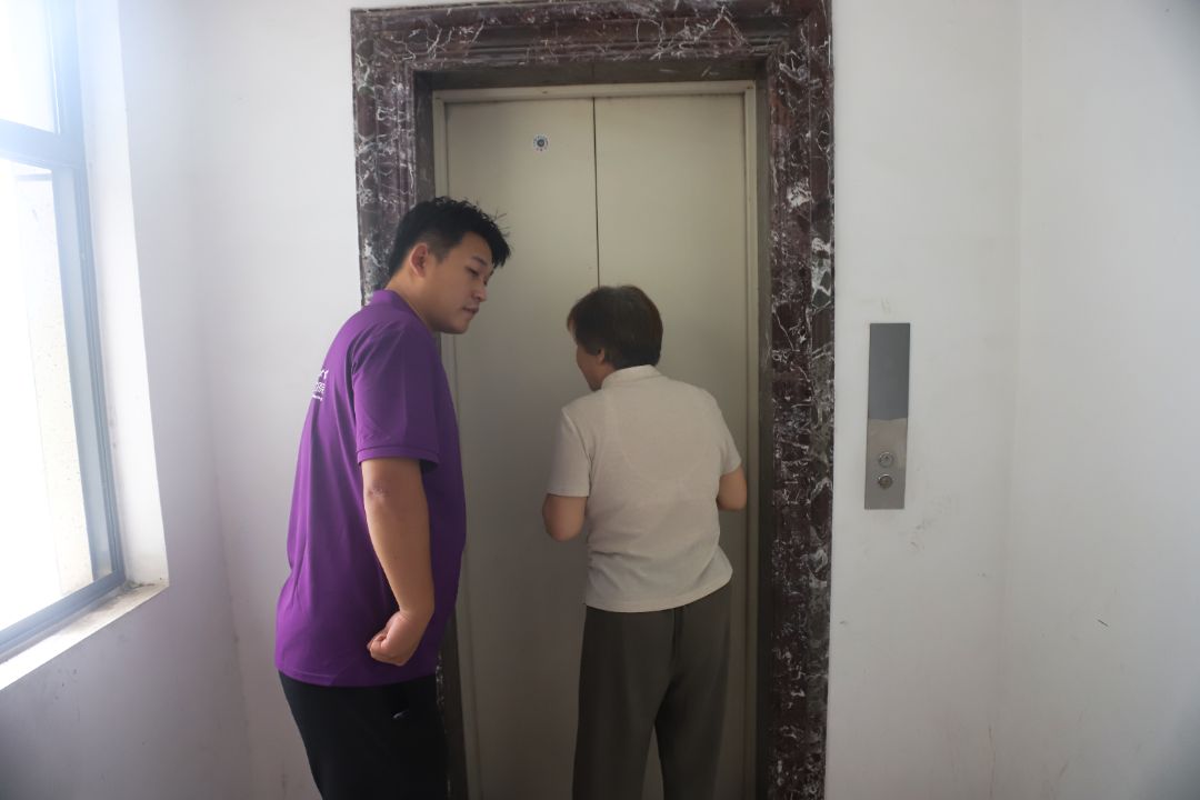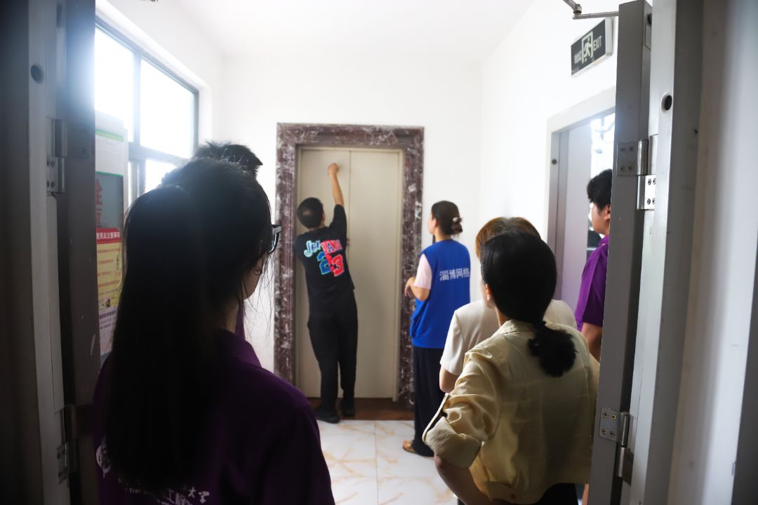針對電梯困人情況,救援工作同步展開。實踐團成員根據物業提供的電梯停運分布圖,逐一到涉事樓棟底層值守,通過敲擊轎廂壁確認被困人員位置,并向臨時指揮小隊傳遞轎廂編號、被困人數等關鍵信息。值得注意的是,本次電梯停運事件中,1名實踐團成員亦被困于電梯內,其在被困期間保持鎮定,并及時安撫其他被困人員情緒。其余實踐團成員在得知同伴被困后,迅速調整分工,在加速推進整體救援工作的同時,協助物業人員搬運應急救援設備,在電梯井口周邊拉起警戒線,防止無關人員靠近干擾救援。