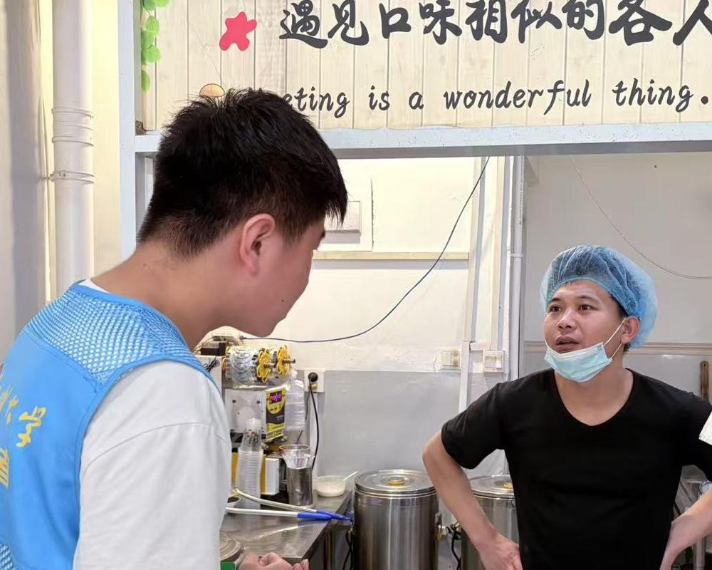 圖為志愿者與孟記高唐老豆腐商家進行學習溝通。