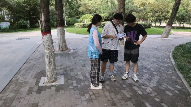 圖為志愿者進行線下調查問卷的發(fā)放。