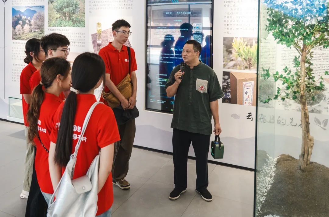 在展示中心內,講解員向實踐隊員系統介紹了苔子茶的悠久歷史,通過播放宣傳片,隊員們直觀了解到苔子茶在當地經濟社會發展中的重要地位,它既是富民強村的“金葉子”,也是承載民族記憶的文化符號。此外,講解員還詳細闡述了北川苔子茶樹的品種特性與茶葉的獨特品質,以及當地延續百年的傳統采摘方式——茶農們遵循“清明前采芽、谷雨前采葉”的古訓,以手工精細采摘,既保證了茶葉鮮嫩度,也延續了與自然和諧共生的農耕智慧。