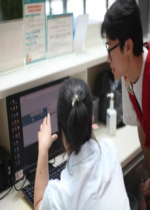 活動開始,實踐團與醫院負責人完成對接,隨即進入門診服務區域,在醫護人員指導下系統學習智慧醫療系統操作。成員們聚焦掛號分診、急診綠色通道觸發、特殊患者信息同步等核心功能,通過模擬高齡孕婦優先就診、兒童急診數據聯動等場景,深入理解“人機協同”的服務邏輯,同步記錄系統在老年患者操作適配、信息提示清晰度等方面的優化空間,為后續形成改進建議奠定基礎。