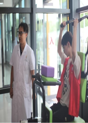 最后,實踐團前往康復訓練中心,在明亮通透的康復訓練區,實踐團成員端坐于康復器械前,雙手握住黑色把手,在醫護人員的指導下,緩緩發力完成拉伸動作。醫護人員緊盯其動作軌跡,適時提醒“背部挺直,感受肩胛發力” 。這種“代入式體驗”,讓團隊跳出“旁觀者”身份:從握把的舒適度,到發力時的阻力反饋,再到康復動作與指引標識的匹配度,甚至座椅對不同體型的貼合度,都被納入觀察維度。這些從“使用者視角”捕捉的細微痛點,為后續優化康復設備與服務流程,獲取了很多具體數據 。