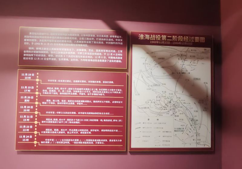 圖為淮海戰役第二階段經過要圖及相關作戰指令展板,呈現關鍵戰役脈絡與歷史細節 。 黃新儼 供圖