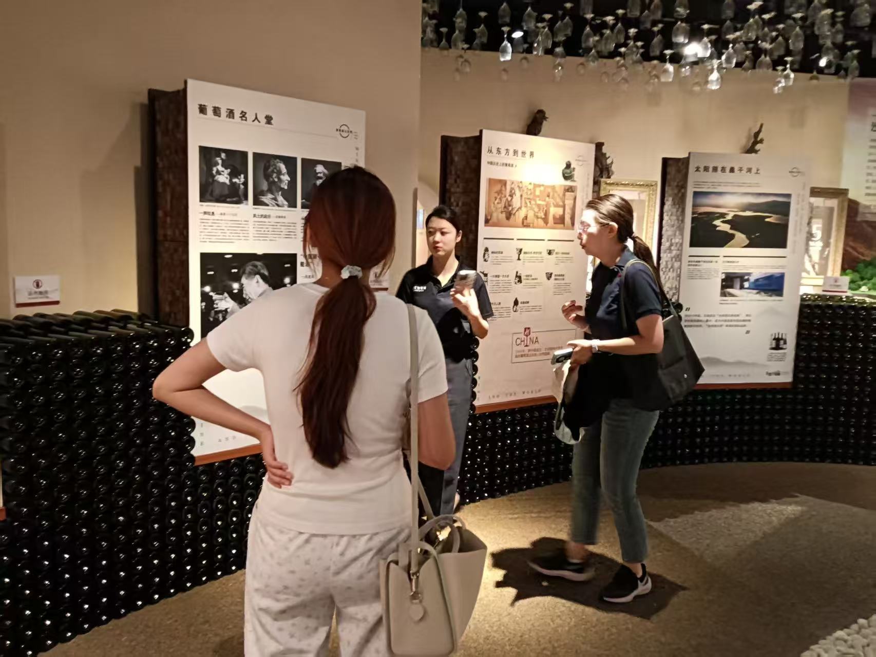 在參觀過程中,同學(xué)們還深入了解了酒莊的釀造工藝與品牌文化積淀。展示中心用上萬(wàn)只酒瓶建成,每一瓶都承載著時(shí)間的沉淀與品牌的記憶。天花板上方懸掛著1978只酒杯,象征著酒莊建廠的歷史起點(diǎn)。展廳中不僅保存了建廠初期的原始樣酒、老設(shè)備和標(biāo)志性產(chǎn)品樣本,也展出諸如為2008年北京奧運(yùn)會(huì)定制的紀(jì)念酒等具有特殊歷史意義的產(chǎn)品,成為中國(guó)葡萄酒文化演進(jìn)的縮影。學(xué)生們?cè)诮庹f員引導(dǎo)下走進(jìn)起泡酒車間,深入了解傳統(tǒng)法起泡工藝的釀造過程,從瓶中二次發(fā)酵到手工轉(zhuǎn)瓶、除渣、補(bǔ)液等環(huán)節(jié),無(wú)不體現(xiàn)出對(duì)技藝的尊重與品質(zhì)的執(zhí)著。相比于一般工業(yè)化生產(chǎn)線的標(biāo)準(zhǔn)化流程,桑干酒莊在工藝層面展現(xiàn)出更高的精致度和藝術(shù)性,這種匠心精神也深深感染著每一位調(diào)研成員。