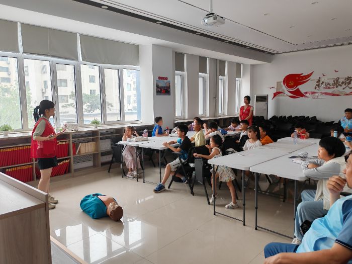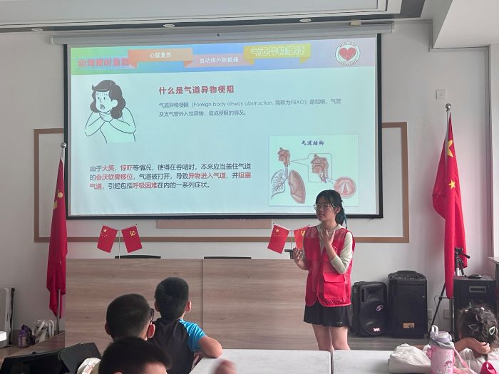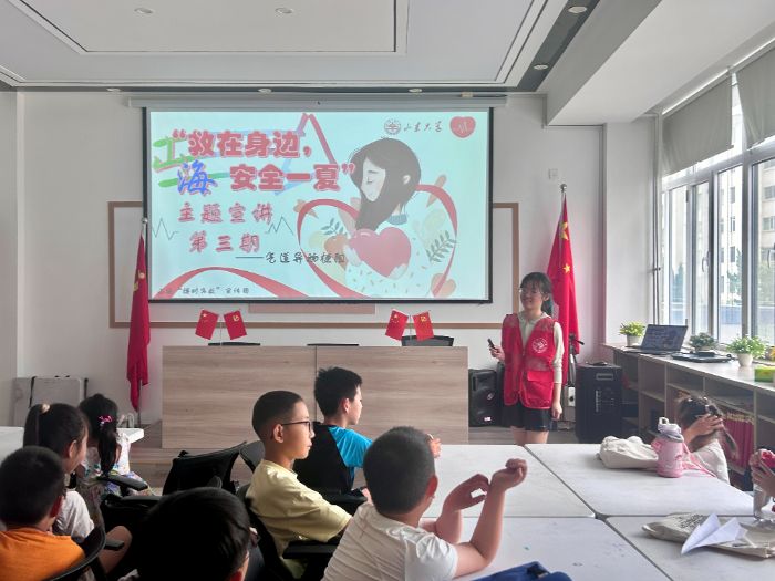 7月24日上午,威海市環翠區怡園街道濱州街社區的活動室里熱鬧非凡,30余名小學生齊聚一堂,參加“救在身邊,安全一夏”主題宣講第三期活動。山東大學“博時急救”宣傳團的志愿者們,帶著生動的教具和趣味互動,為孩子們普及海姆立克急救法,教大家應對氣道異物梗阻這一夏季常見意外。