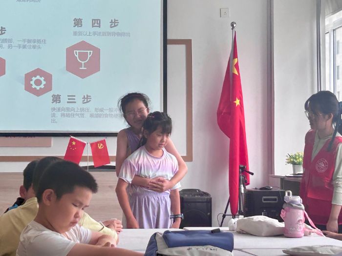 接著在志愿者的指導下對著模擬人練習:“要用力向上擠,就像要把肚子里的‘氣球’擠爆嗎?”“對啦,就是這樣!”志愿者笑著糾正她的手勢,“拳頭位置要準確,不然就沒效果啦。”孩子們兩人一組互相練習,活動室里不時傳來“加油”聲,稚嫩的動作里透著認真。