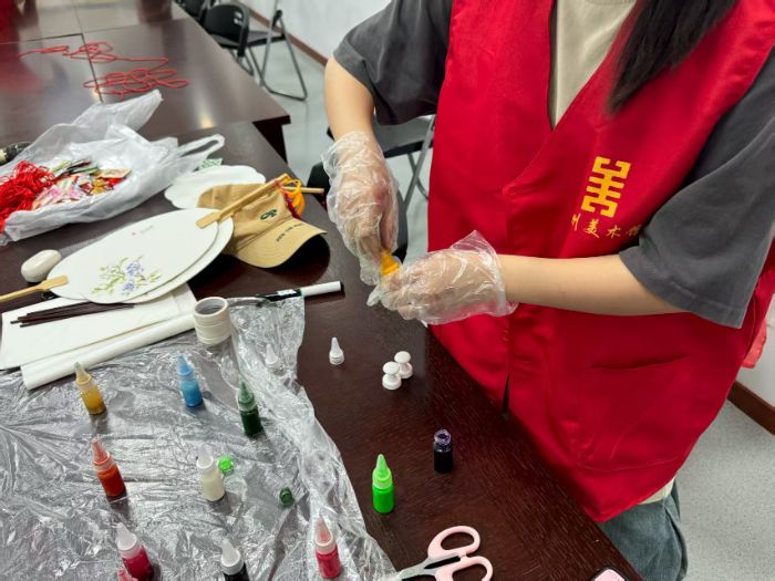 漆染扇骨,情與意生作為東方美學的重要物質載體,扇子超越了單純的納涼功能,其中漆扇憑借其溫潤如玉的材質特性與深邃瑰麗的色彩表現,歷來被文人階層視為珍貴的掌中雅玩。這類工藝品集中體現了中國傳統漆藝的精髓,通過巧妙融合繪畫技法、雕刻工藝以及鑲嵌技術等多種傳統手工藝,使每件作品都呈現出獨特的藝術價值。在實踐環節中,參與者通過自主調配色彩與繪制扇面的創作過程,深入體驗了漆扇制作的藝術魅力。據志愿者錢女士觀察,一位年長參與者最初對色彩搭配存在顧慮,但在參考經典作品后,最終采用了靛藍與金粉的創意組合,使成品在沉穩中透露出華貴氣質;該參與者對自制漆扇反復欣賞時由衷贊嘆:"傳統工藝竟能如此完美地呈現現代審美意趣!"