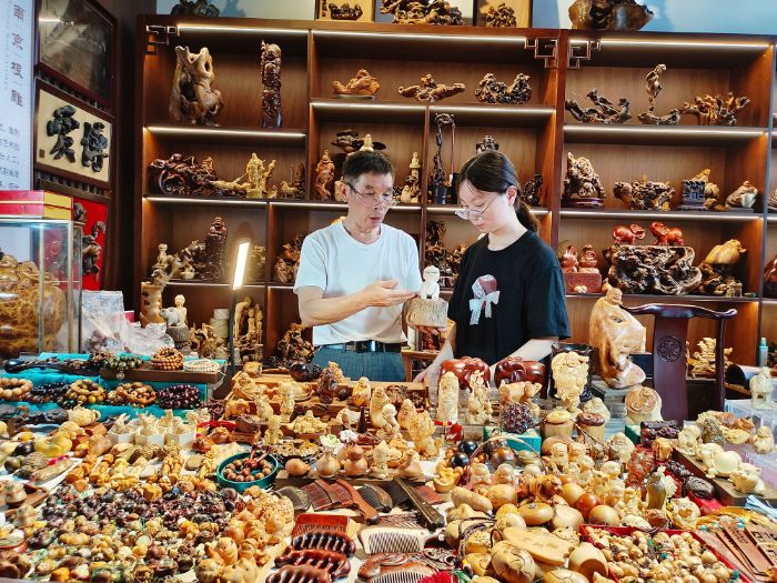 訪談互動中,萬老師分享的根雕家族傳承故事,引發志愿隊成員對少數民族技藝傳承模式的探討。隊員們現場講述了侗族大歌“口傳心授”、維吾爾族木卡姆家族傳承等案例,與根雕傳承理念形成對照交流。針對根雕與現代文化融合的實踐,志愿隊提出可借鑒少數民族文化創新經驗,如將傣族孔雀元素、壯族銅鼓紋樣融入根雕創作,進一步豐富作品的民族文化內涵。