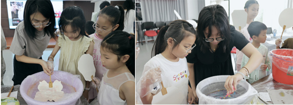 在主講老師邵佳勵(lì)與副講老師花榕檀的指導(dǎo)下,孩子們化身小小漆藝師。挑選心儀色漆滴入水中,凝神觀察色彩流動(dòng)滲透的自然韻律;輕提團(tuán)扇覆于水面,瞬息吸附轉(zhuǎn)印出獨(dú)一無二的紋理。“看!我的扇子像極光!”“我的像海底珊瑚!”創(chuàng)作臺(tái)前驚嘆四起,孩子們興奮分享成果,在流動(dòng)的漆色中深化了對(duì)周三“溝通小宇宙”課程的理解。活動(dòng)全程貫穿協(xié)作精神,社工引導(dǎo)孩子們互借工具、共護(hù)操作環(huán)境,讓千年漆藝課堂成為踐行雙向溝通的生動(dòng)舞臺(tái)。本次漆扇活動(dòng)作為繼“花草燈”非遺實(shí)踐后的第二場非遺體驗(yàn)活動(dòng),持續(xù)以“可觸摸的文化”增強(qiáng)兒童民族認(rèn)同。
