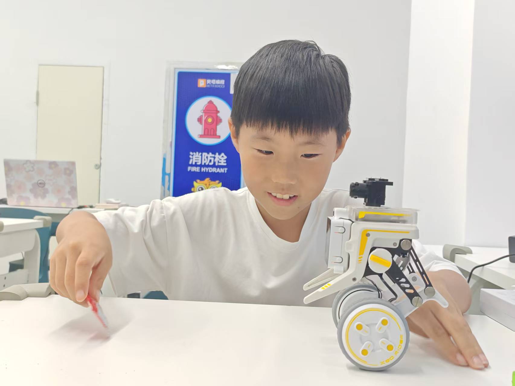 孩子的第一眼總會(huì)被機(jī)器人可愛的外形吸引,他們觸摸擺弄著這個(gè)可愛的伙伴,也與小機(jī)器人建立了初步的“友誼”。