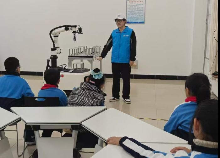 圖7 小學生在機器人產業學院觀摩機械臂精準分揀演示