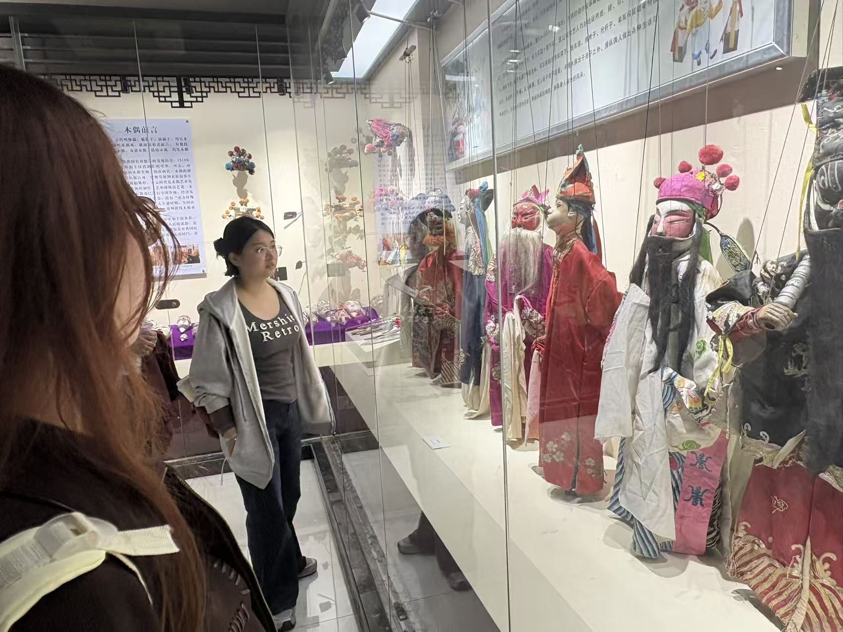 在陜西秦腔博物館,同學(xué)們通過實物展陳、圖文資料和多媒體展示,系統(tǒng)了解秦腔的歷史淵源、藝術(shù)特色與發(fā)展脈絡(luò)。重點觀摩了傳統(tǒng)木偶戲道具、經(jīng)典劇目服飾、臉譜工藝以及相關(guān)碑刻書法作品,深入了解秦腔作為國家級非物質(zhì)文化遺產(chǎn)所承載的藝術(shù)價值與人文精神。通過現(xiàn)場學(xué)習(xí),同學(xué)們對秦腔在文學(xué)、音樂、美術(shù)與民俗等多領(lǐng)域的融合性特征有了更為全面的認(rèn)識,進(jìn)一步提升了對傳統(tǒng)戲曲文化的理論素養(yǎng)。